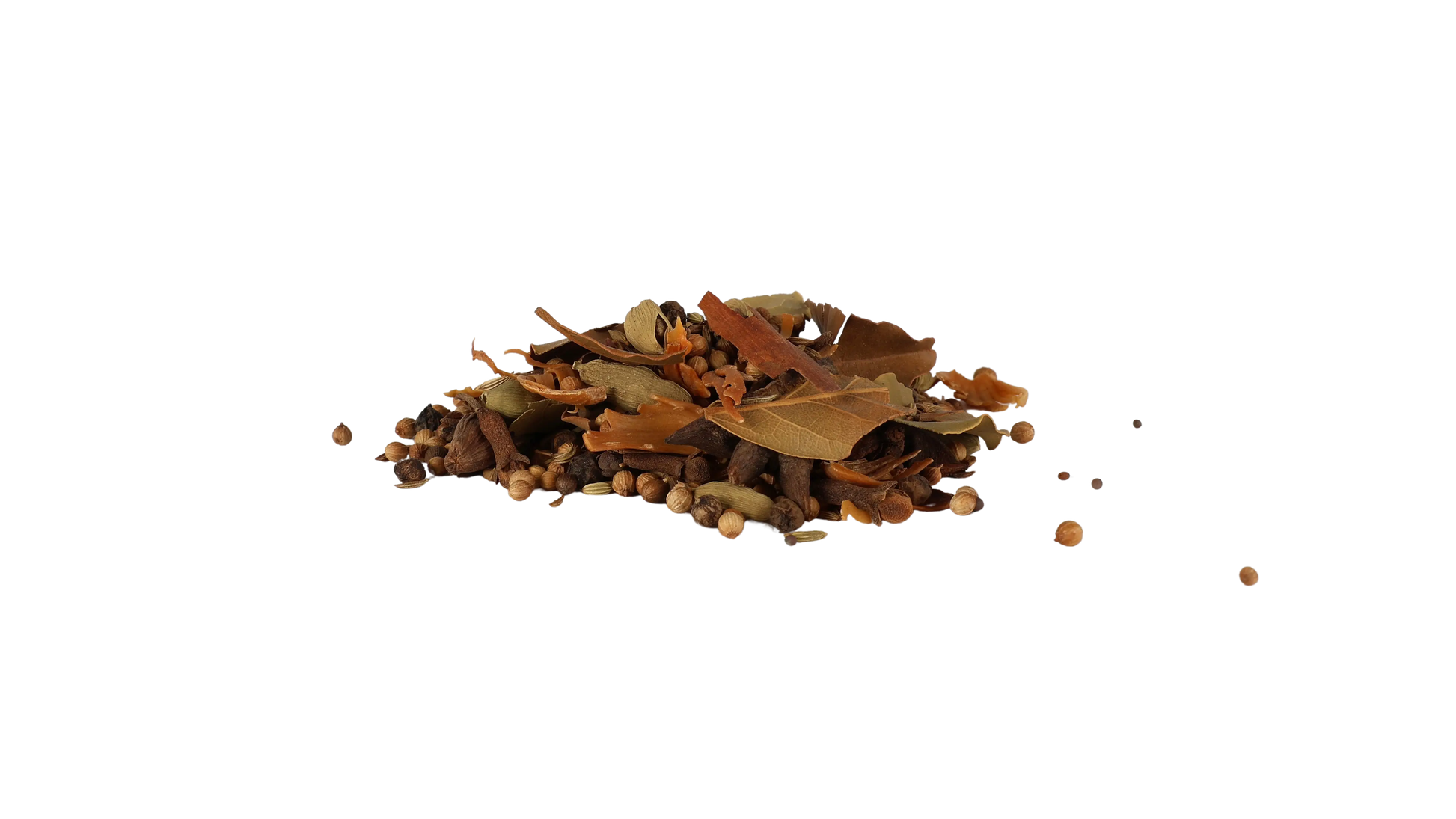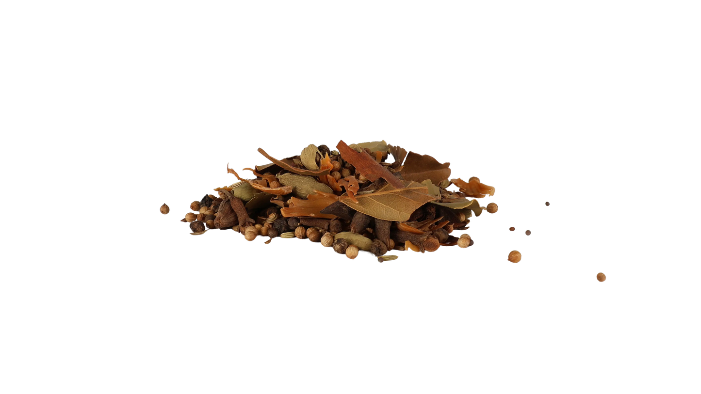 Black and green cardamom, cloves, nutmeg, pepper, coriander seeds, Ceylon cinnamon, cumin.
