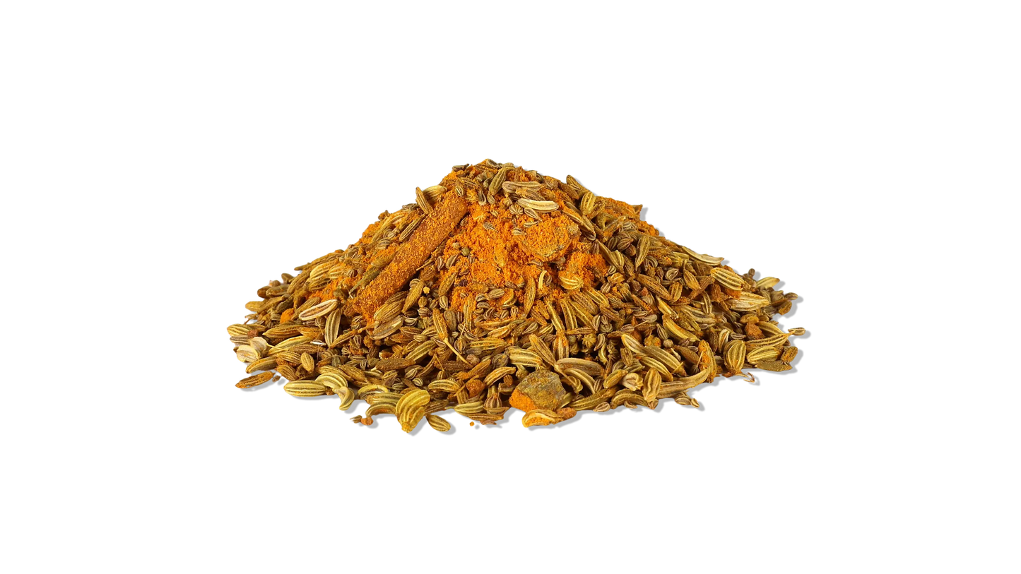 Fennel, cumin, Ceylon cinnamon, turmeric, asafetida, caraway.